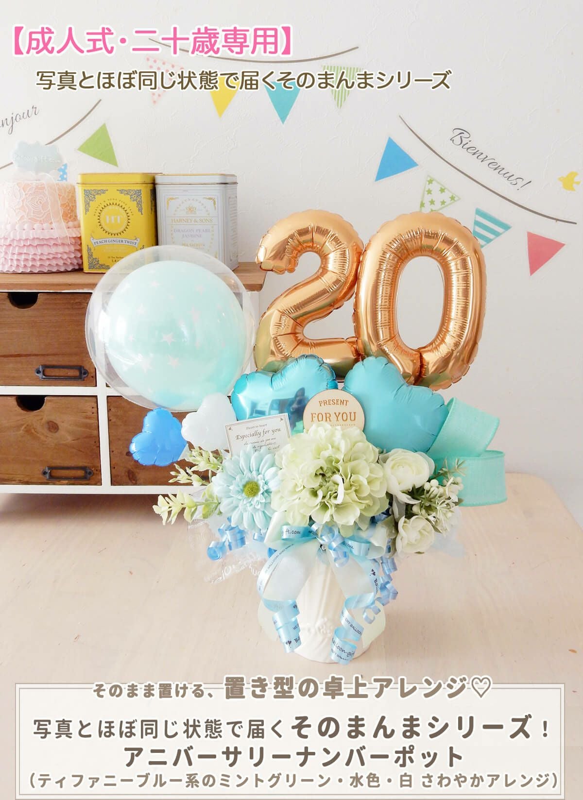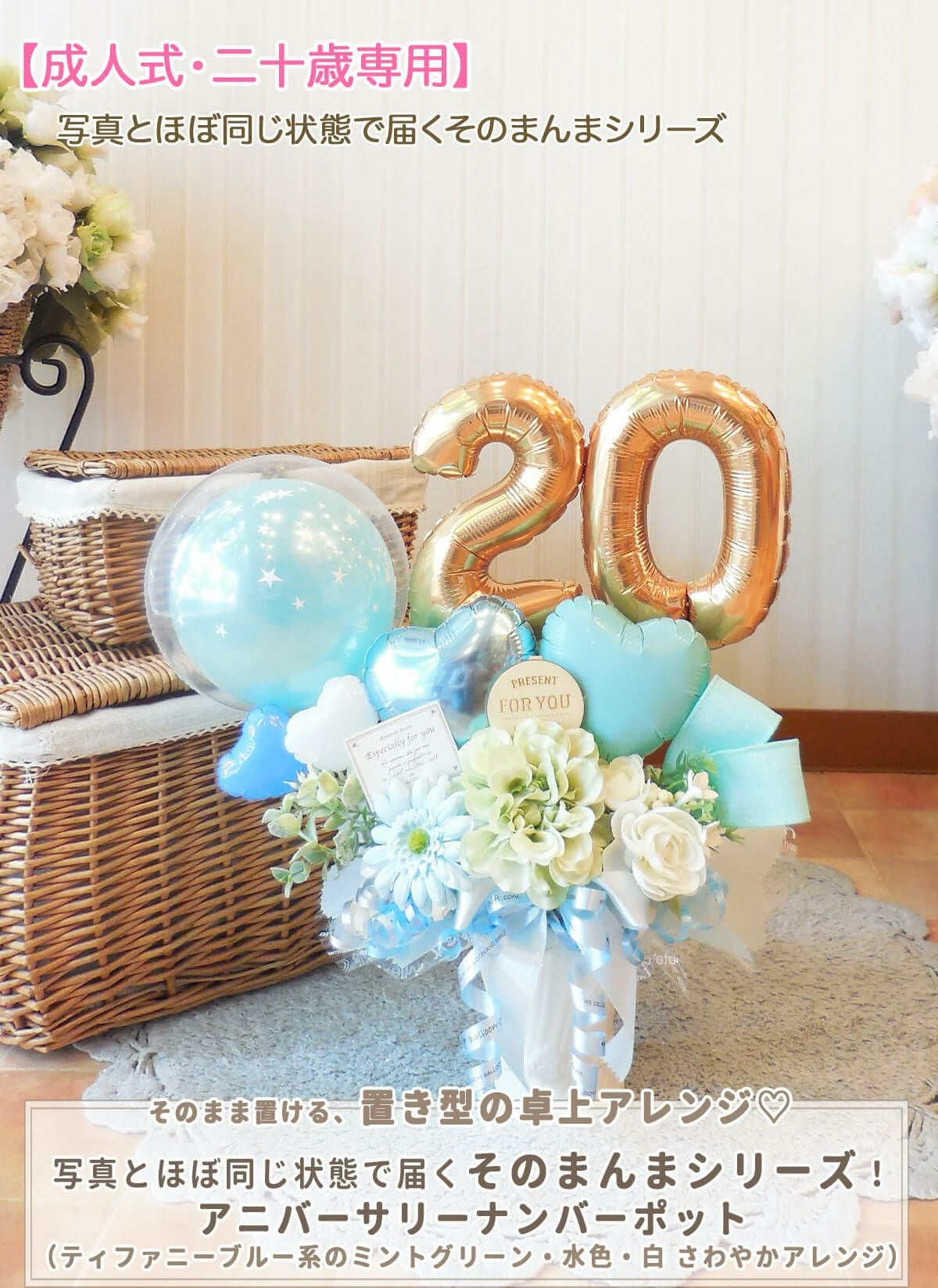 3. 【成人式・二十歳専用】 写真とほぼ同じ状態で届くそのまんまシリーズ!★送料無料★卓上アレンジ:アンプロンプチュ・ナンバー ティファニーブルー系(数字20または18/ミントグリーンと水色×白系 さわやかアレンジ) 【送料無料 ゆっくり便 8,200円 税別/BL-B/D2/TK4】