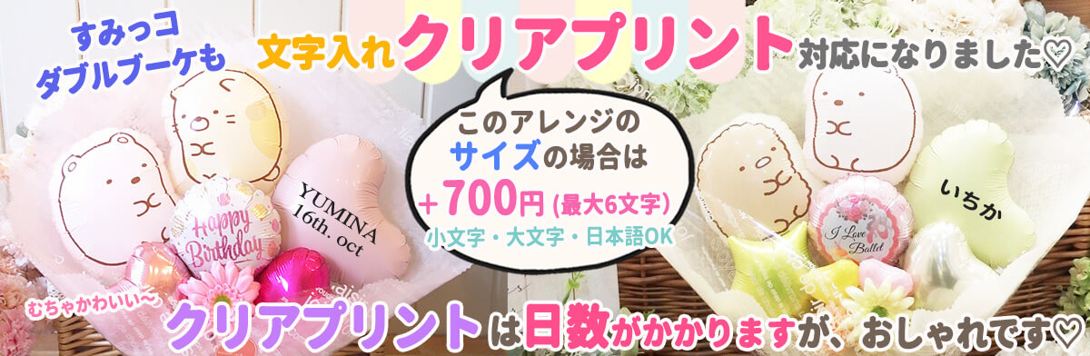 このブーケは小さいサイズのバルーンを使うため、浮力・見やすさを優先し1〜2行までで加工します。(このアレンジは横幅が狭いので1行に付き7文字程度までになります)
