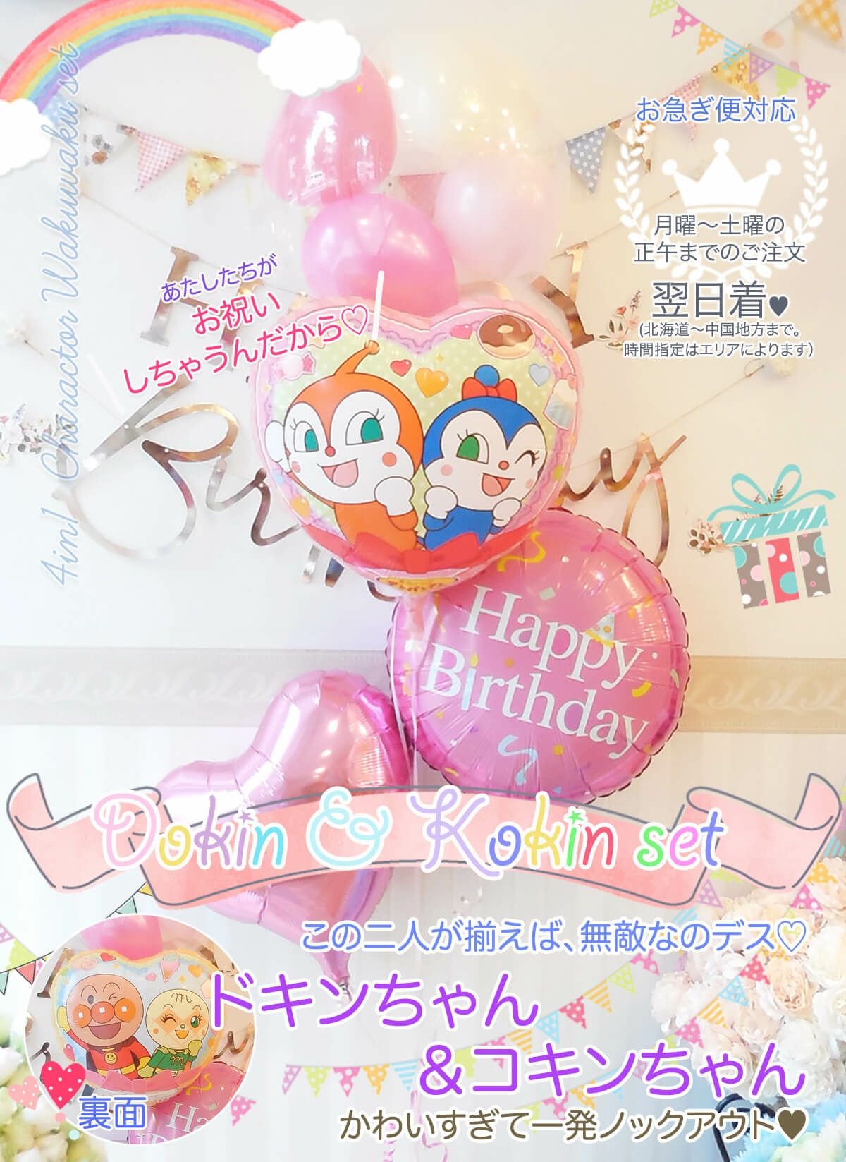 5. めっちゃかわいい最新作! 「ドキンちゃんとコキンちゃんのわくわく4個セット」《4in1 中箱 送料込7400円》 お誕生日や発表会にオススメのバルーン電報【BL-E】