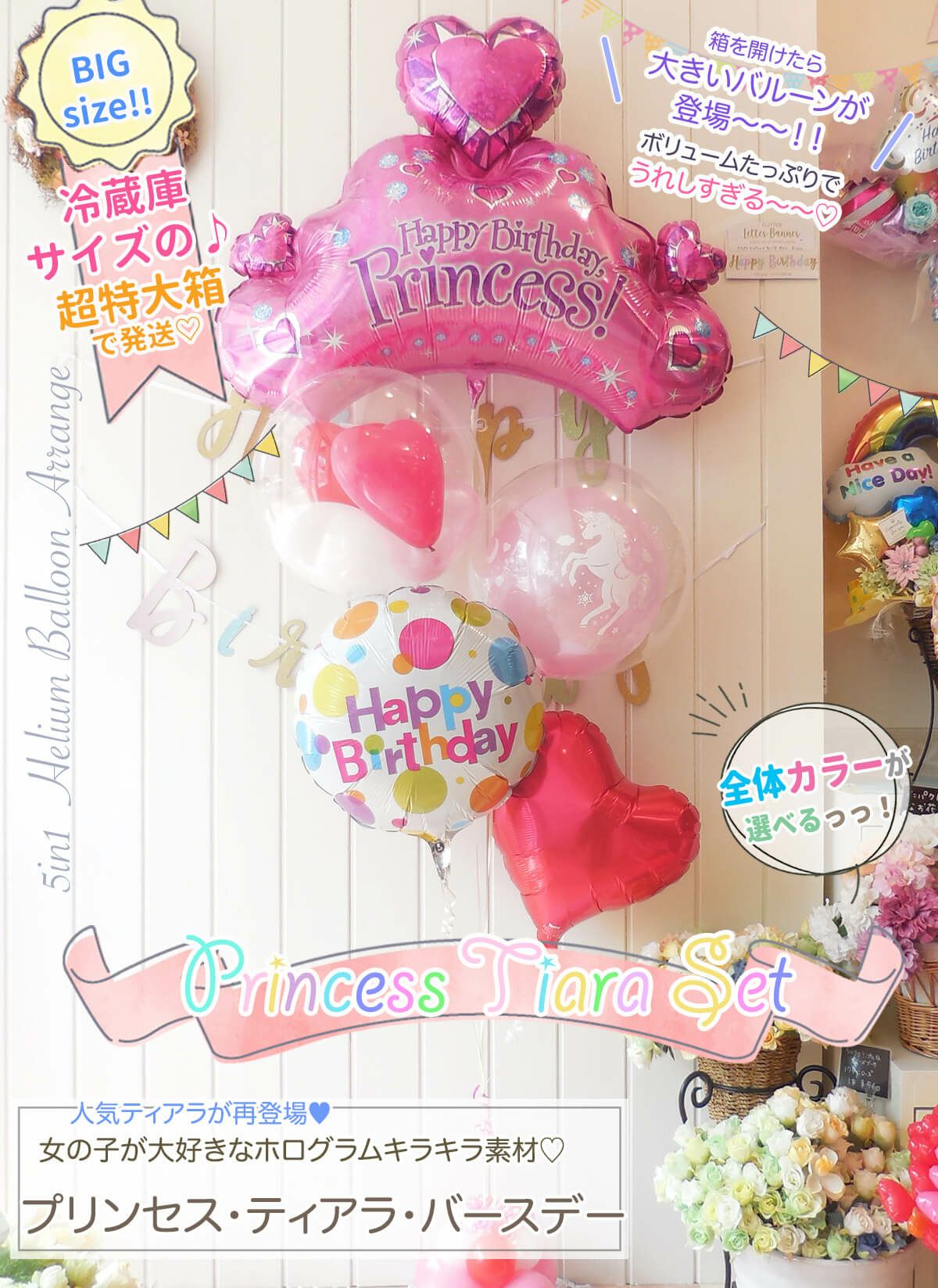 特大箱でお届け 5in1DX プリンセス・ティアラ・バースデーセット ★お誕生日専用バルーン電報★ 《5in1DX 送料込11400円》【BK-GHI】