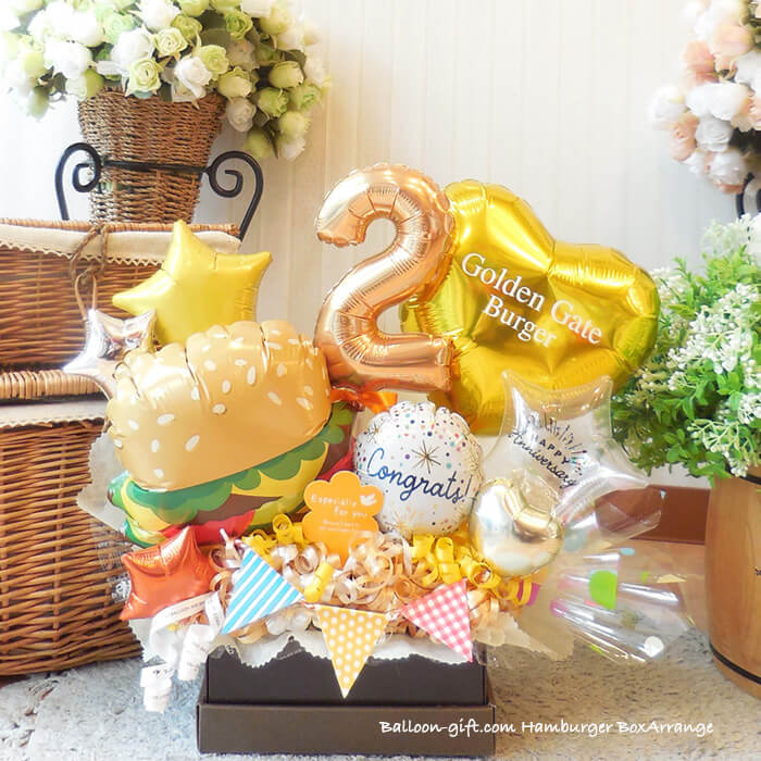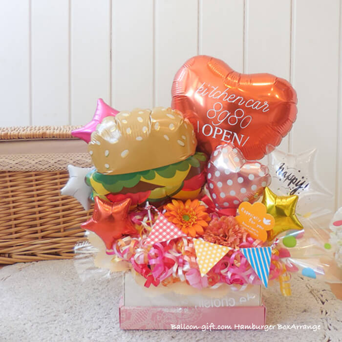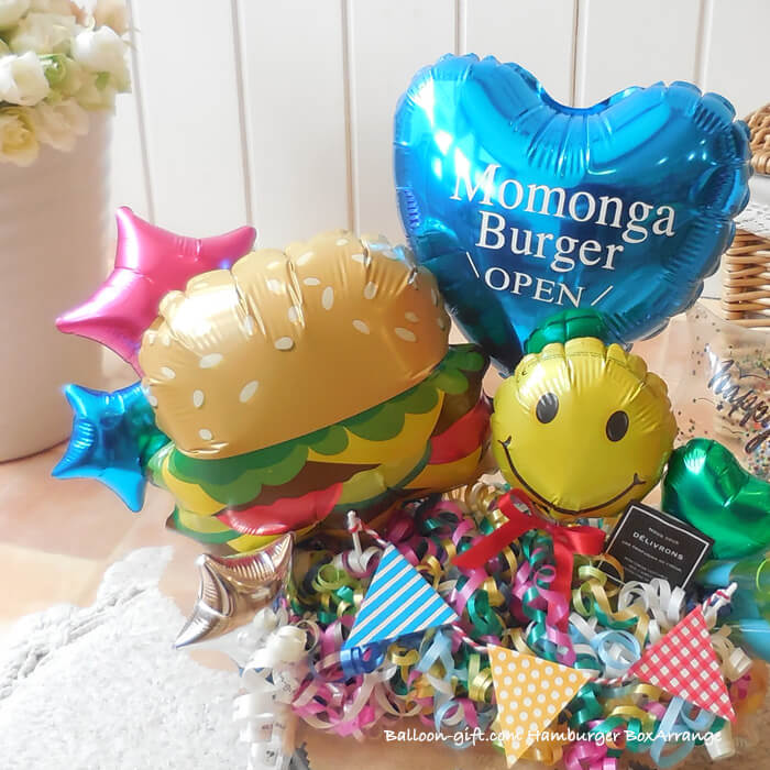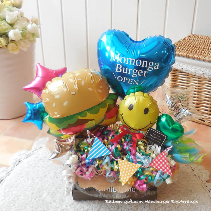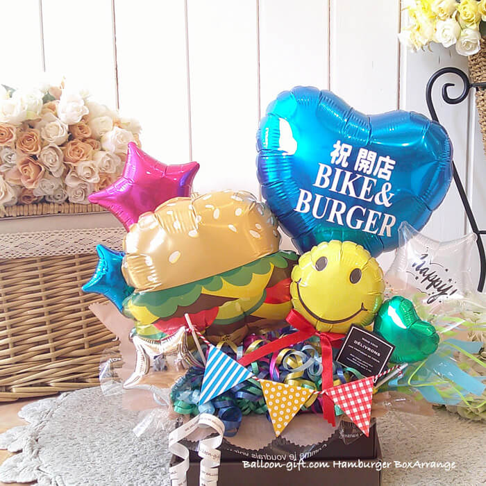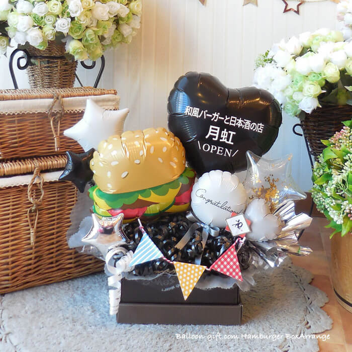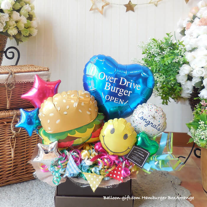 3. ハンバーガーショップ開店祝い専用、しかもクリアプリント込! 「ハンバーガー・オープン・ボックス」《送料無料7200円》 開店や周年のお祝いにおすすめのバルーン電報★【BL-B/C2(100)/D3】