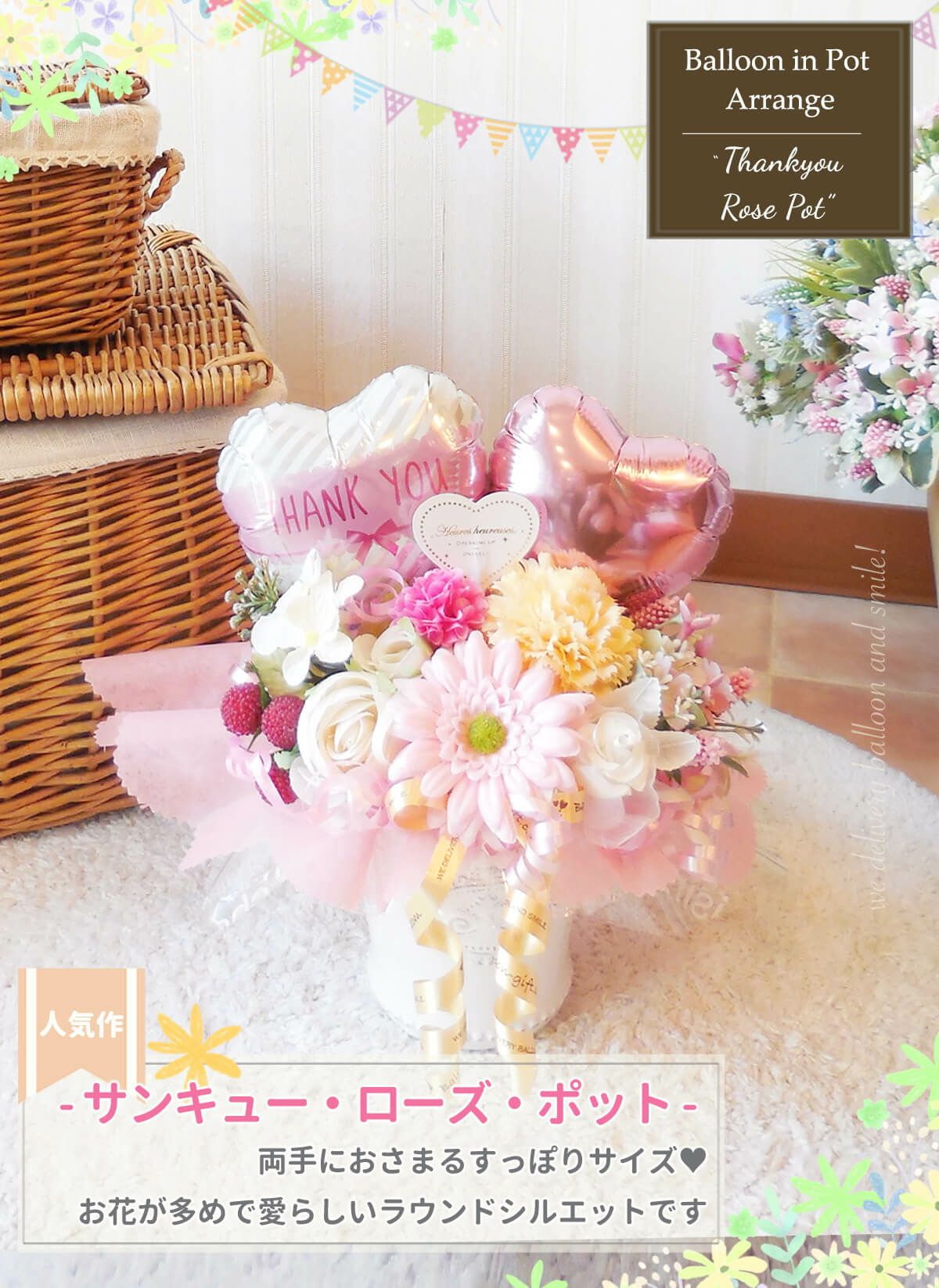 持ち帰りやすい「やや小さめアレンジ」がキュート! お花が多めの小ぶり卓上アレンジ「サンキュー・ローズ・ポット」 送別会に・感謝を込めたアレンジを 《送料無料 6000円》 送別会や卒業卒園・引越しなどにオススメのバルーン電報【BL-A/D2】