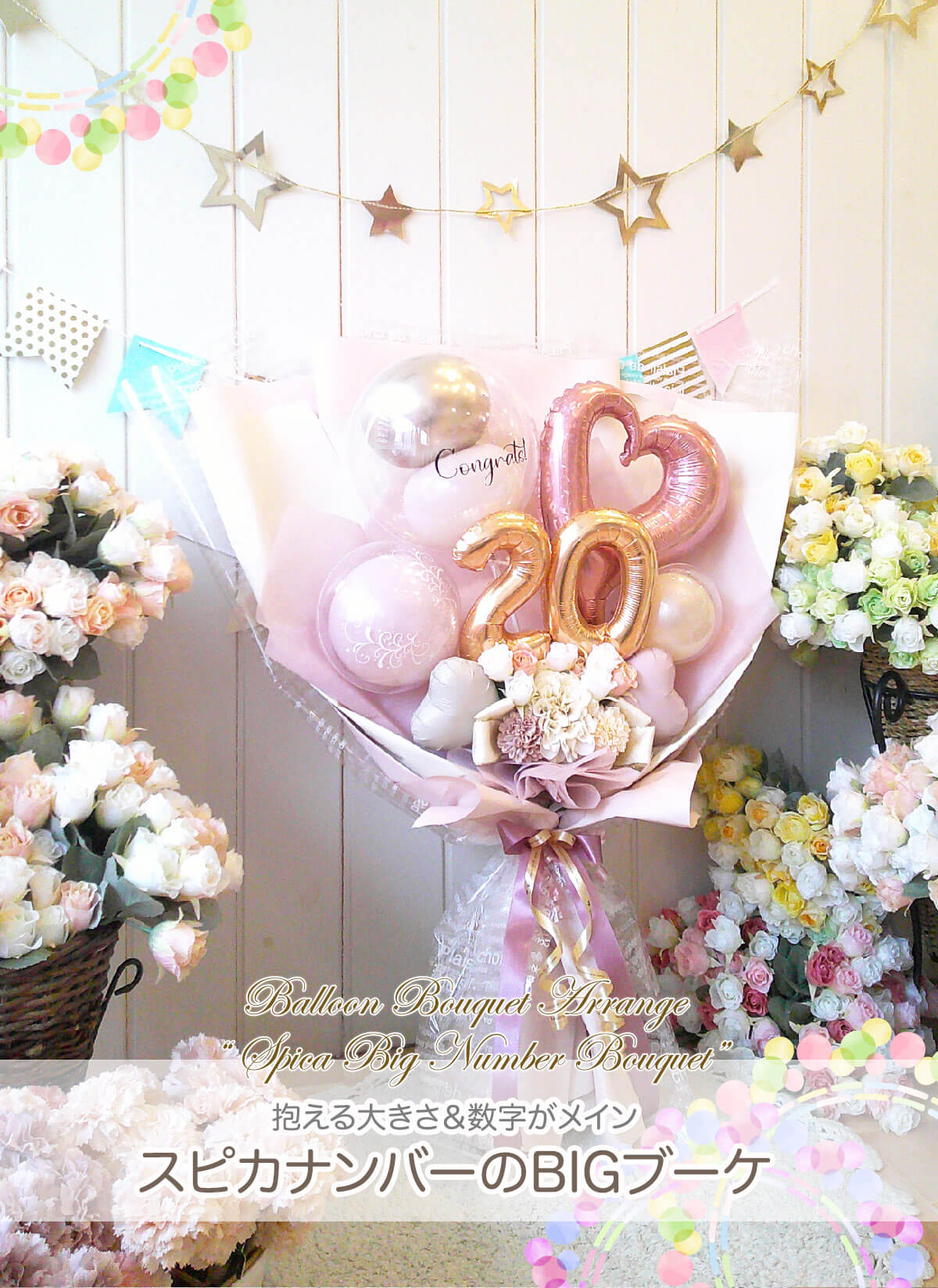3. 数字入りの大きなバルーン花束☆『スピカナンバーのBIGブーケ』(クリアプリント付き・通常シーズン) (数字もカラーも変更OK!)送料込11,450円・店舗受取9,850円 税別【要日程ブーケ/特急オプションなら早めお届けOK!】【BL-C/D・BOUQUETLV4/(CTK10)TK10】