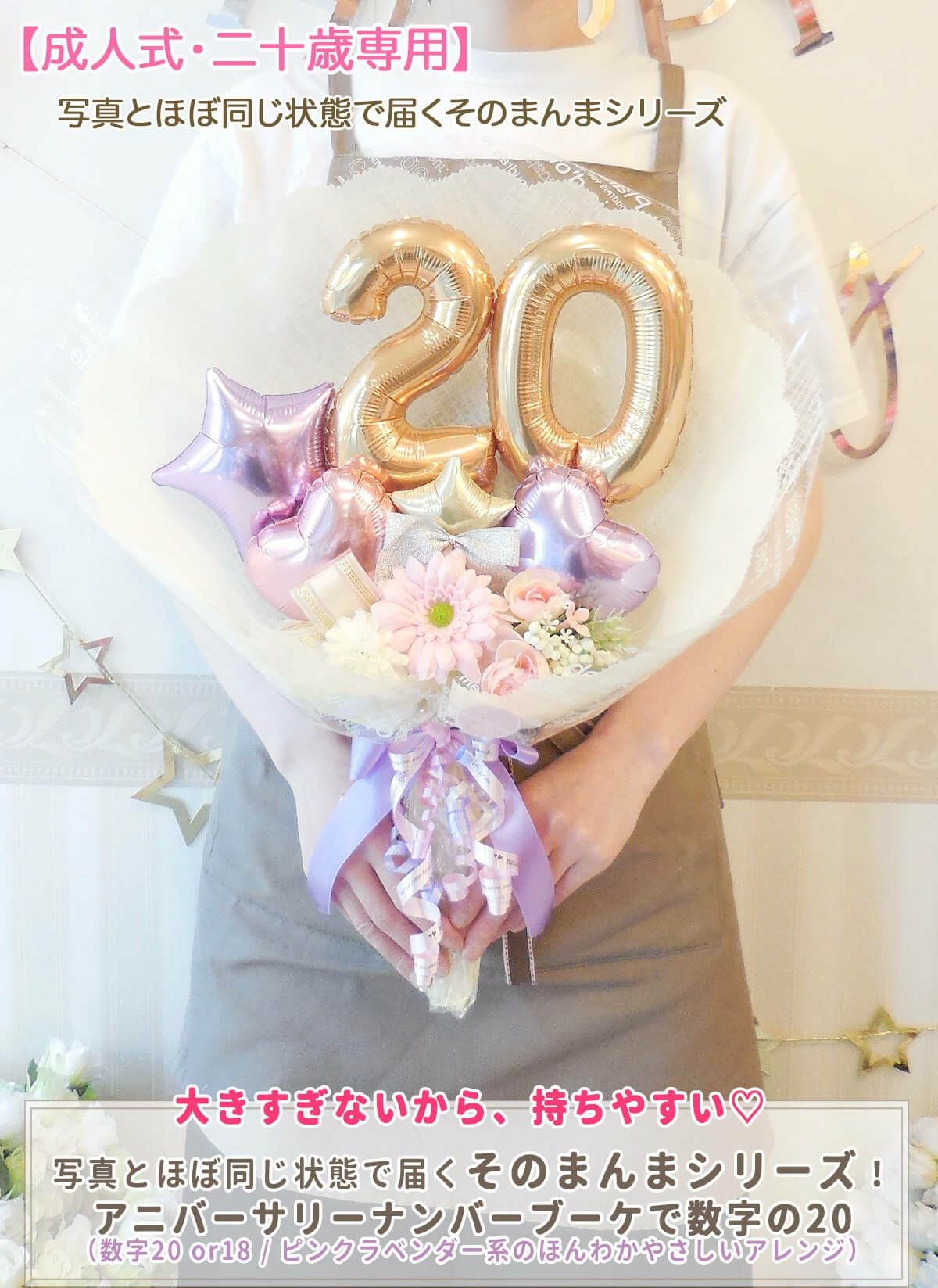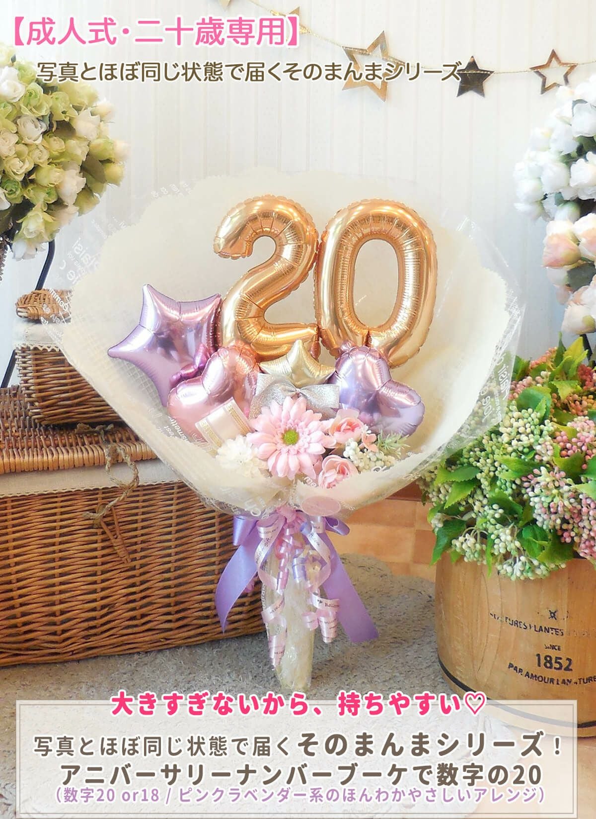 3. 【成人式・二十歳専用】写真とほぼ同じ状態で届くそのまんまシリーズ!花束ブーケ:アニバーサリーナンバーブーケで数字の20 ピンクラベンダー系(数字20または18/ピンクラベンダー系のほんわかアレンジ)《店舗受け取り5750円/小箱で送料込 6700円》【BL-B/C/TK3】