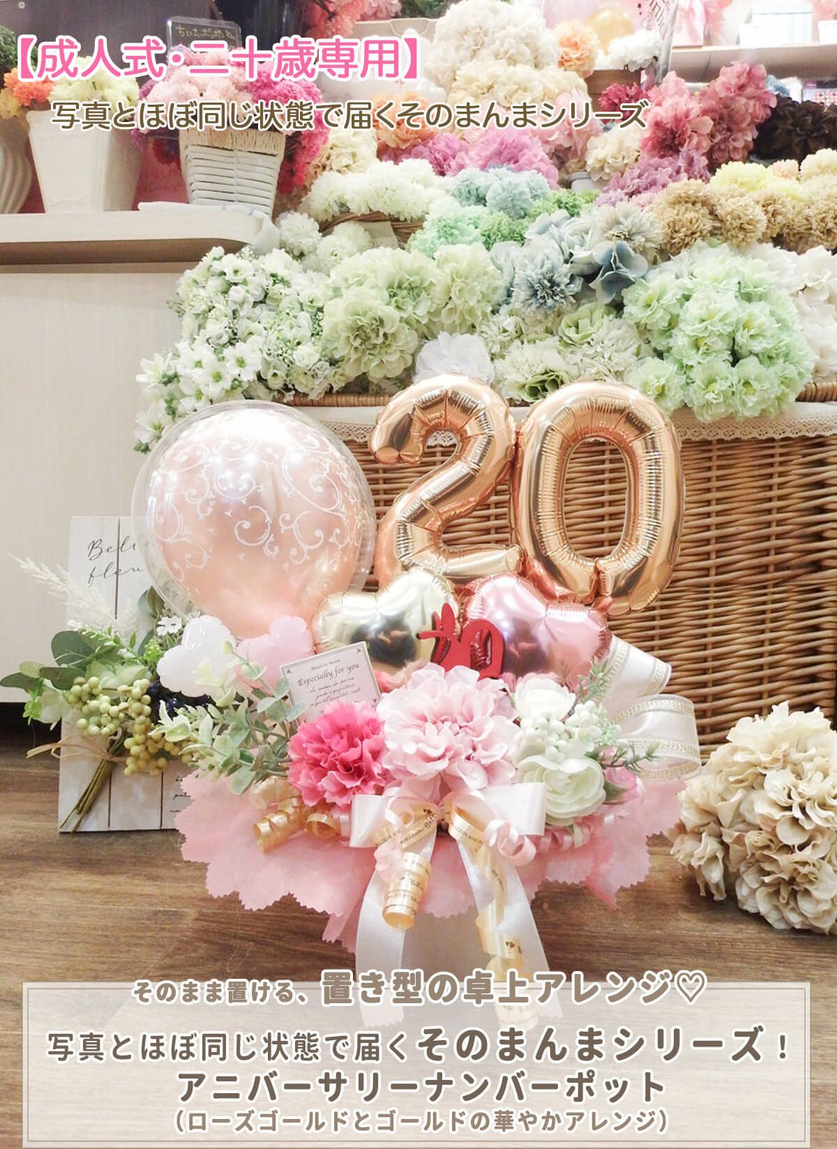 3. 【成人式・二十歳専用】 写真とほぼ同じ状態で届くそのまんまシリーズ! ★送料無料★卓上アレンジ:アンプロンプチュ・ナンバーのサンプル1(数字20または18/ローズゴールドとゴールドの華やかアレンジ)送料込7,200円(税別)