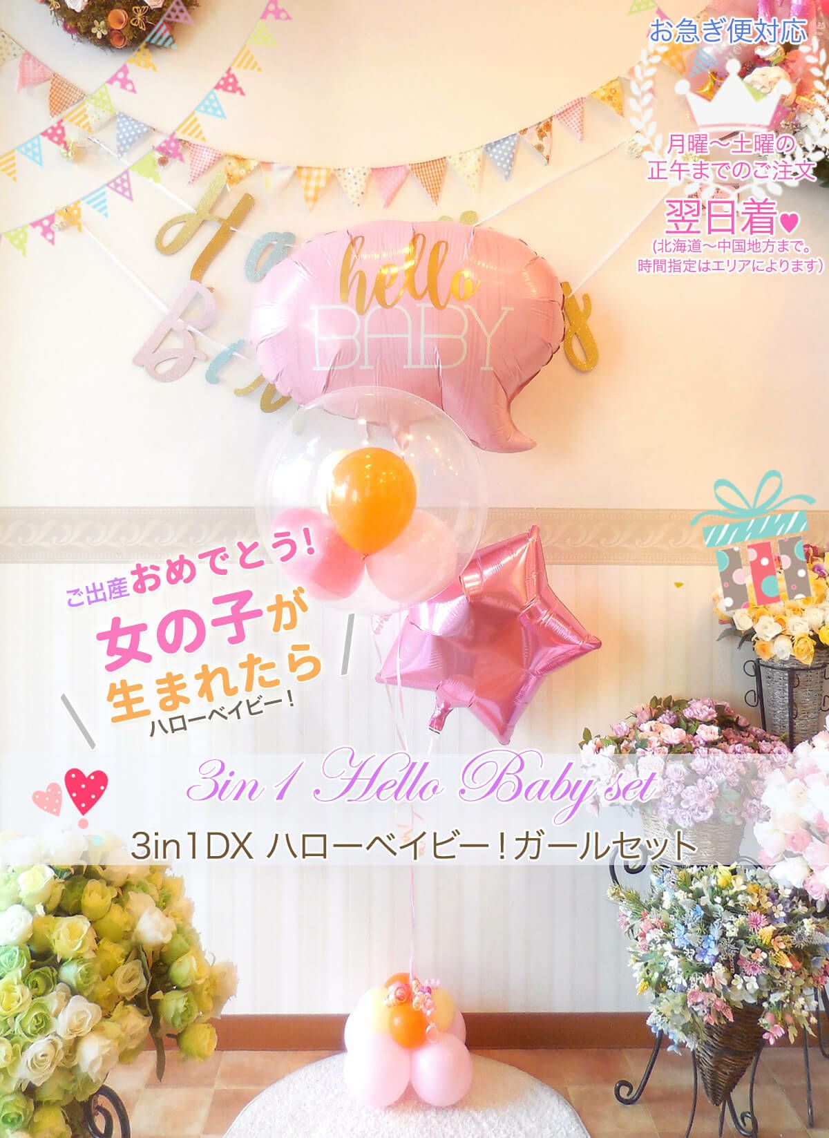 3. 3in1DX『ハローベイビー!ガールセット』【BL-E】女の子のご出産祝いに人気のバルーン電報店舗受け取り・発送どちらもOK! 《中箱 送料込 7350円 /店舗受取:5750円 税別》