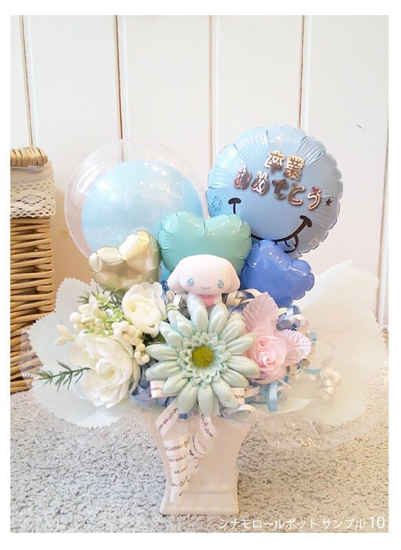 手乗りサイズより少しだけ大きい、「やや小さめアレンジ」がキュート!★お急ぎの方は『特急製作のオプション』がお選びいただけるようになりました! 小さめで可愛い!『シナモロールdeバルーンポット』
