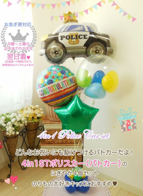 4in1ST『大箱☆ポリスカー(パトカー)のにぎやか4個セット』【BL-E/F】 お誕生日やハーフバースデー・開店周年・発表会にオススメのバルーン電報 店舗受け取り・発送どちらもOK! 《大箱 送料込 9100円 / 店舗受取:6850円 税別》のレビュー